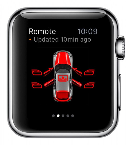 O Apple Watch oferece informações sobre a situação do veículo e permite que certas funções do sejam monitoradas e controladas por meio de toque ou gestos. Por exemplo, o mostrador “re moto ” visualiza se as janelas, portas, tampa do porta-malas e teto solar estão fechados; o veículo pode também ser trancado, se necessário, por meio de pressão do dedo (a função “Force Touch”).