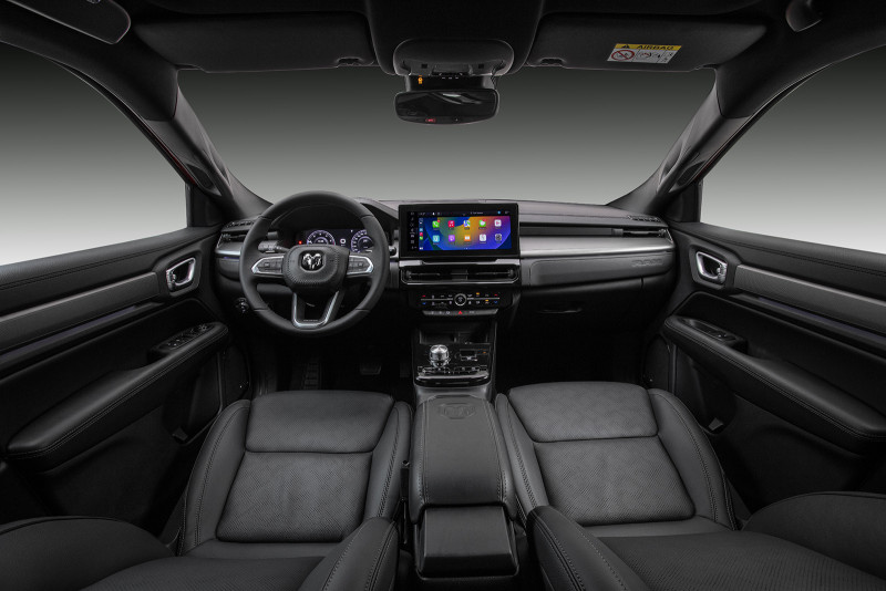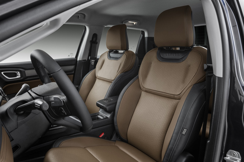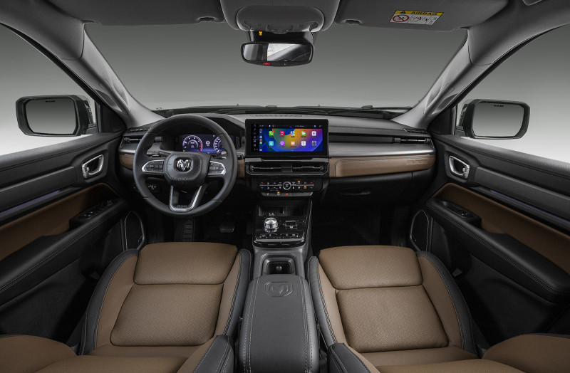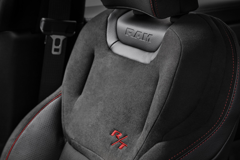 O interior da Rampage foi elaborado cuidadosamente para trazer luxo e bem-estar aos ocupantes. Os bancos foram inspirados em móveis premium, criando uma sensação de poltrona de sala de estar. Tudo com um nível muito alto de acabamento, como se vê na escolha de materiais nobres como couro perfurado e suede (este, exclusivo da versão R/T, que também conta com costuras vermelhas para incrementar ainda mais o visual esportivo).