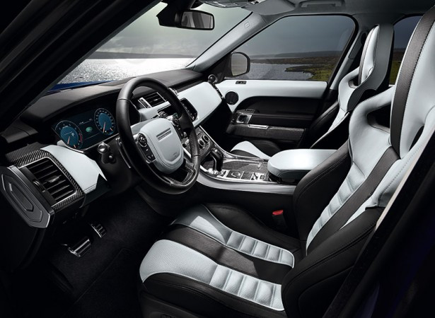 O Range Rover Sport SVR traz para-choque dianteiro redesenhado com robustas entradas de ar frontais em forma de trapézio com acabamento em preto. Suas linhas laterais foram redesenhadas para proporcionar ainda mais esportividade e apelo aerodinâmico, ao mesmo tempo em que sua traseira carrega um grande aerofólio.