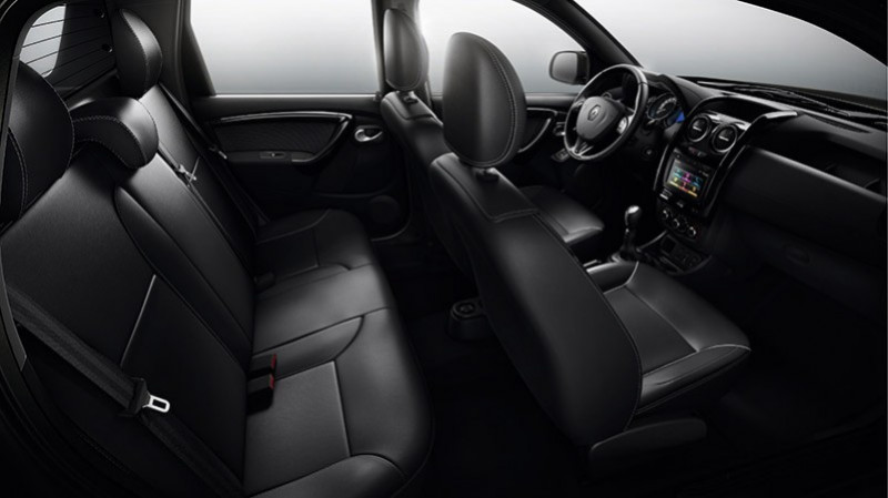 Outro opcional das versões Dynamique são os bancos forrados parcialmente em couro. O Duster Oroch será comercializado em sete diferentes cores: Verde Esmeralda; Branco Neige; Prata Etoile; Cinza Acier; Petro Nacré e Vermelho Fogo.