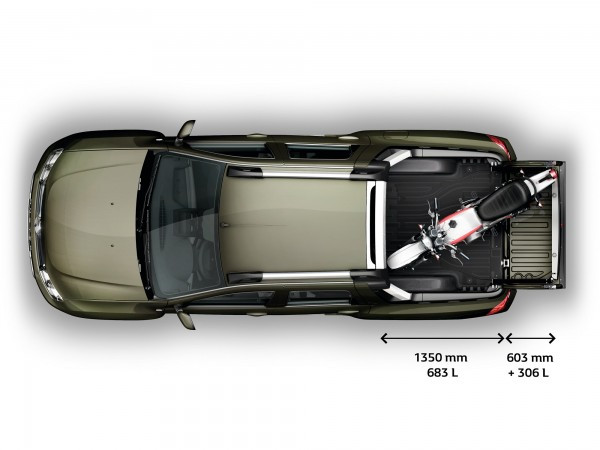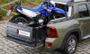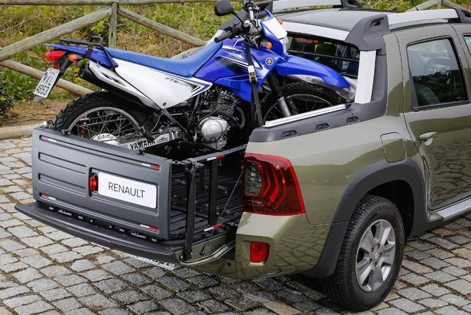 Por outro lado, a Renault não economizou no espaço, e nem na capacidade de carga da caçamba da Oroch. Ela conta com generosos 2,82 cm no entre-eixos. Essa é a maior distância entre picapes compactas. E também pode carregar até 650 kg, com capacidade volumétrica de até 683 litros, na caçamba (o maior volume da categoria). O espaço é generoso, com 1,35 metros de comprimento. Mas a Oroch contará ainda com um acessório que permitirá estender o comprimento da caçamba. Para isso, basta abrir a tampa e instalar o extensor da caçamba, sobre a tampa aberta. Com isso, o comprimento máximo acrescenta mais 60 cm. E a tampa da caçamba pode receber até 80 kg em peso. Esse extensor terá também espaço para placa do veículo, atendendo a legislação. O espete fica instalado na parte de baixo da caçamba com trava à chave, para não tomar espaço das cargas, na caçamba e nem ser furtado.