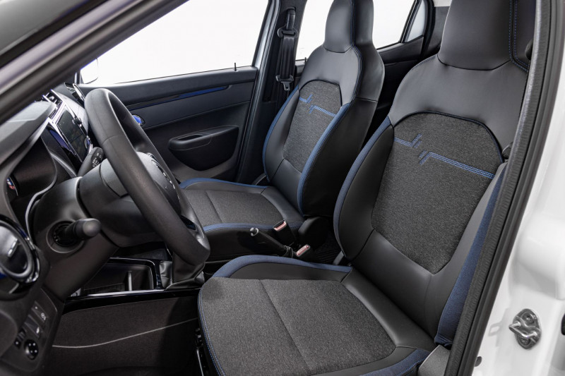 Na versão Intense os bancos têm novo tecido com detalhes na cor azul nas laterais e no bordado central do encosto. Já na versão Outsider, as costuras da coifa do câmbio e dos bancos, além de detalhes, são da cor verde Citron.