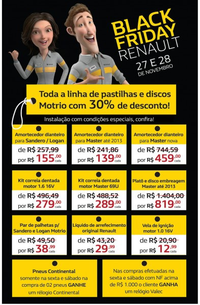 A Renault foi além da tradicional “sexta-feira” com condições especiais para a compra de um veículo: serão três dias de promoção, de 26 a 28 de novembro. Os veículos da linha Logan e Sandero estarão com descontos de até R$ 7 mil, enquanto o Renault Duster contará com bônus de até R$ 10 mil. Modelos da linha Kangoo também poderão ser adquiridos com abatimento de R$ 10 mil.