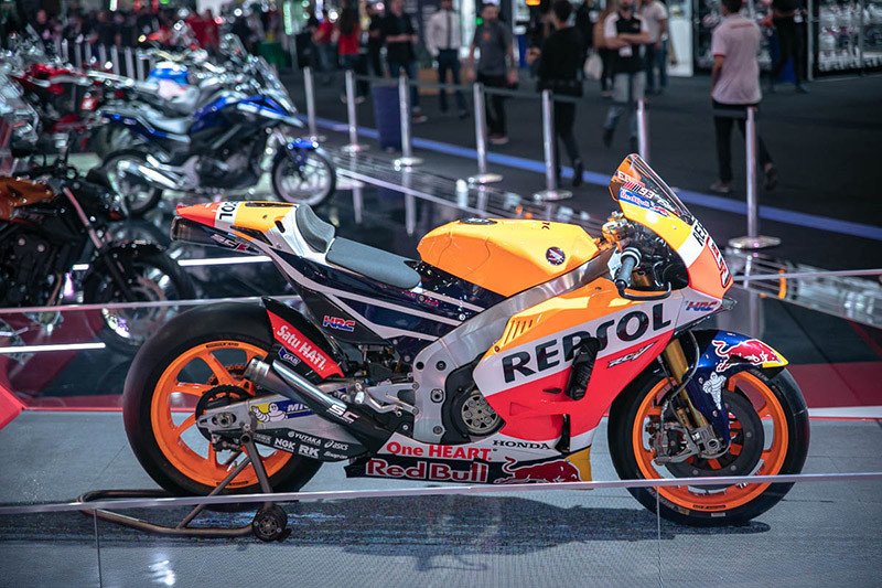 =11ptUm dos destaques no estande da Honda é a RC213V, moto campeã do MotoGP pilotada pelo espanhol Marc Márquez, que possui seis títulos do campeonato mundial de motovelocidade. O motor explora a potência máxima e permanece durável durante as 19 corridas da temporada. Já a suspensão mantém o pneu em contato com o solo e produz aderência máxima para aguentar solavancos e ondulações. Enquanto isso, a carenagem leve de fibra de carbono desempenha um papel importante ao tornar o modelo o mais aerodinâmico possível.