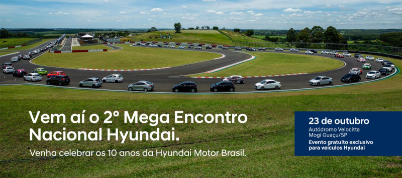 A Hyundai promove no próximo dia 23 de outubro, no Autódromo Velocitta, em Mogi Guaçu (SP), o segundo “Mega Encontro Nacional Hyundai”, evento gratuito que pretende reunir veículos da marca, de qualquer ano e modelo, inclusive os comerciais, em um domingo cheio de atividades, trazendo para perto de seus clientes as emoções de uma etapa da Copa Shell HB20, a maior categoria de automobilismo de uma única marca no país. A ação será mais uma oportunidade de celebrar os 10 anos da Hyundai no Brasil junto aos seus clientes.
