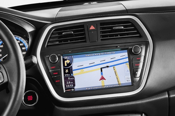 O S-Cross traz sistema Multimídia que engloba rádio FM, CD player, suporte a MP3, entrada USB no console central e vídeo de 8 polegadas com navegação integrada.