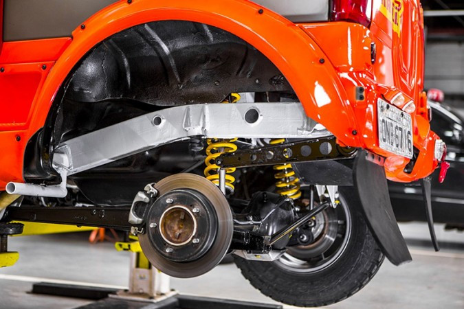 Para a competição, o Jimny ganhou também barra estabilizadora regulável na traseira, freio a disco nas quatro rodas com balança reguladora de pressão dianteira / traseira. O desenvolvimento incluiu amortecedores reguláveis de competição, sendo duas opções JRZ ou Ohlins com garrafas de nitrogênio remotas, molas principais e auxiliares ‘tender’ da marca Eibach. Além disso, foram desenvolvidos componentes e reforços especiais para suportar cargas e acelerações extremas com extenso trabalho de engenharia e modelagem, e simulações de distribuição de tensões e cargas nos componentes de chassi e suspensão.