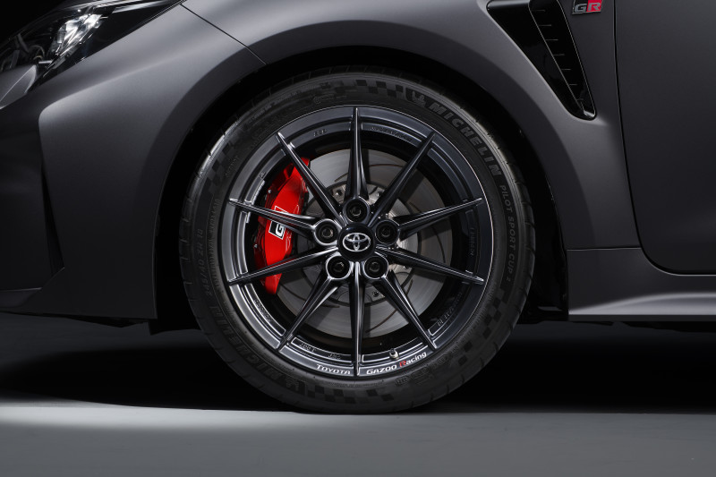 O sistema de freios do esportivo é equipado com pinças monobloco de alumínio de 14” na dianteira e 11.7” na traseira, proporcionando uma resposta de frenagem eficiente e precisa. Além disso, os discos de freio são ventilados e possuem ranhuras, melhorando a dissipação de calor e evitando o superaquecimento durante a frenagem intensa. Aliado a isso, a GAZOO Racing garante uma maior rigidez e leveza para as rodas com as forjadas BBS. Com isso, o carro ganha maior resistência aos impactos e reduz o peso na suspensão.