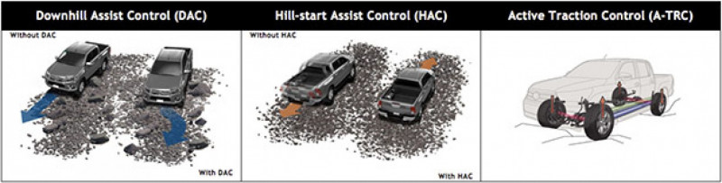 Nas versões SRV e SRX, a nova Hilux está equipada com o assistente de partida em rampas (HAC), dispositivo que melhora a experiência off-road e facilita as manobras em subidas, acionando os freios automaticamente em uma posição de parada.