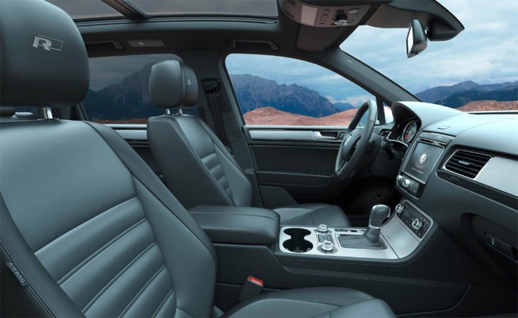 Na versão V8 R-Line a suspensão é a ar, e permite aumentar a distância do veículo em relação ao solo em até 30 cm em percursos fora da estrada. Em velocidades altas, a carroceria é rebaixada automaticamente pela suspensão pneumática. O controle automático de velocidade e de distância (ACC) com “Front Assist” e “City Emergency Braking” (frenagem de emergência na cidade), agora com função stop-and-go, foi aperfeiçoado.
