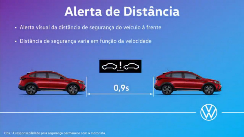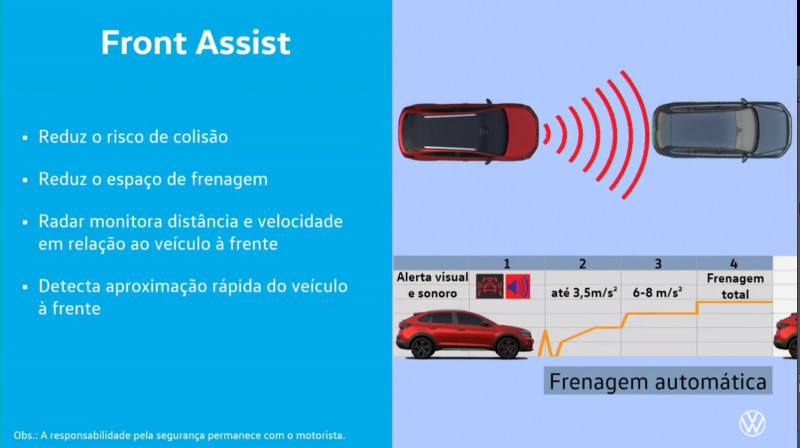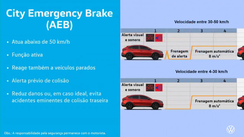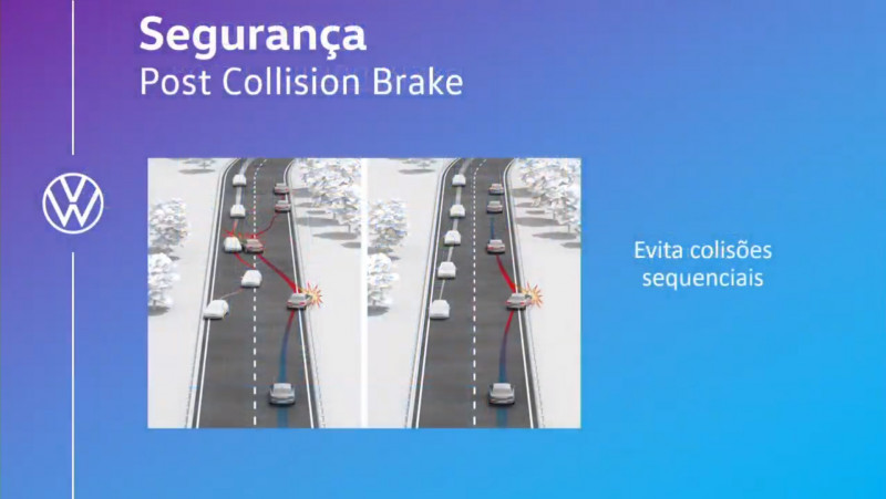 Outro recurso que está presente no Nivus, é o Post Collision Brake. Este sistema reconhece o primeiro impacto (frontal), aciona automaticamente o sistema de freios e evita colisões sequenciais.
