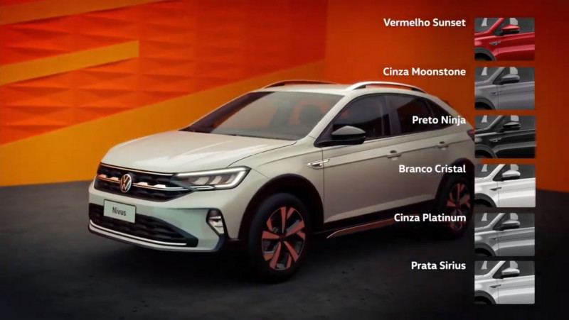 O lineup do Nivus contará com seis opções de cores: Branco Cristal, Preto Ninja, Prata Sirius, Cinza Platinum, Vermelho Sunset e Cinza Moonstone. Estas duas últimas criadas exclusivamente para o modelo.