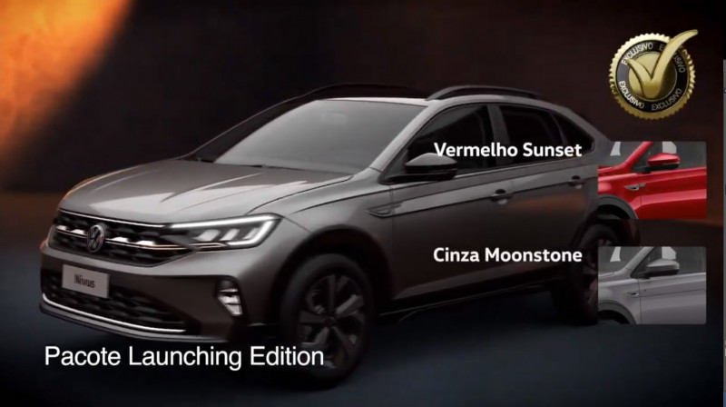 Para celebrar a estreia mundial do Nivus, a Volkswagen preparou uma série especial, a Launching edition. Baseada na versão topo de linha Highline 200 TSI, o modelo vem nas cores Vermelho Sunset ou Cinza Moonstone, com teto e espelhos retrovisores em Preto Ninja, logotipos externos em preto brilhante e belíssimas rodas de liga leve de 17 polegadas Cassino Dark com acabamento diamantado. A diferença fica por conta dos apliques laterais e do para-choque traseiro, e rack de teto, que na opção Vermelho Sunset são em chrome effect e prata, respectivamente, e na versão Cinza Moonstone assume as cores Preto Ninja e preto.