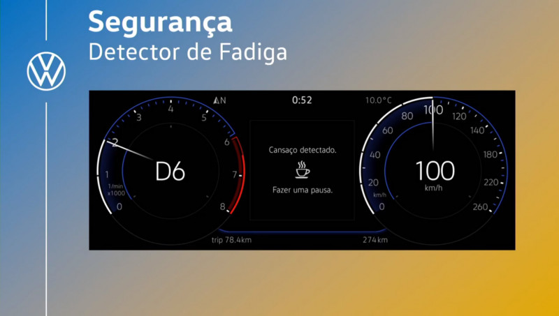 Caso o motorista demonstre sinais de cansaço, o Nivus dispara um alerta visual e sonoro no painel de instrumentos, por meio do Detector de Fadiga, após a análise de uma série de parâmetros, que o condutor pode estar cansado e que precisa, de repente, de um pit-stop para tomar um café e recuperar a atenção ao volante.