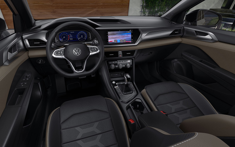 O Taos chega recheado de tecnologia. Seus faróis inauguram a mais nova tecnologia de iluminação da marca, o IQ. Light, além da nova assinatura noturna da Volkswagen. Os faróis full LED ganham em amplitude e alcance, garantindo ainda mais conforto e segurança ao motorista. Outro destaque do modelo é a moderna "ilha digital", composta pelo Active Info Display e pelo infotainment VW Play, em uma incrível combinação de duas telas de 10 polegadas cada uma, algo inédito no segmento. O Taos também possui insertos em couro no painel e nas laterais das portas dianteiras, ganhando ainda mais sofisticação e elegância no interior.