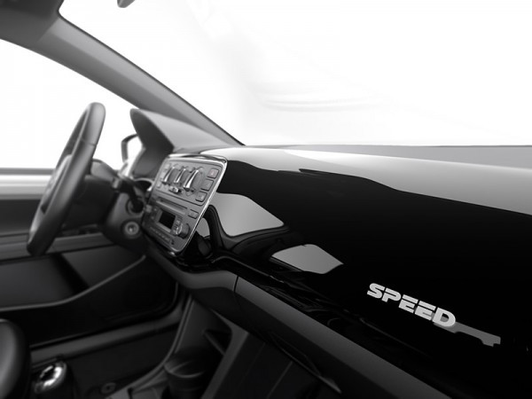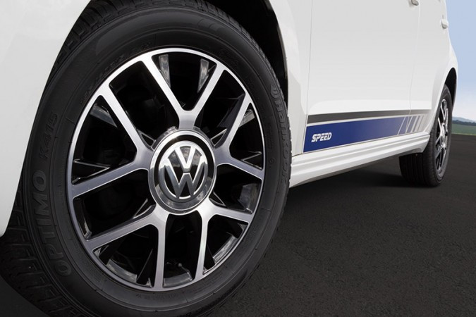 Como diferencial, a nova versão speed up! tem visual exclusivo, com elementos esportivos e uma exclusiva pintura preta no teto e nos para-choques. Oferecido unicamente na cor branca, o speed up! diferencia-se, na dianteira, pela área central do para-choque pintada na cor preto ninja, com os aros dos faróis auxiliares em chrome effect. Nas laterais, traz os retrovisores e faixas pintadas na cor azul. Esse azul remete aos conceitos BlueMotion e Think Blue da Volkswagen. As rodas de liga leve de 15 polegadas, modelo “zurique II”, são exclusivas da versão, em cor preta e diamantadas. A traseira traz para-choque com defletor pintado na cor preta; e a tampa do porta-malas é pintada na cor preto ninja, com a nomenclatura TSI. É importante destacar que a tampa traseira preta foi adotada por todos as versões equipadas com o novo moto r 1.0 TSI Total Flex, diferenciando-as do Up com o moto r MPI.