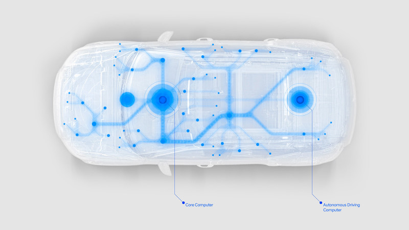 Mudar para uma arquitetura de computação centralizada significa remover muita complexidade. Em vez de depender de várias unidades de controle eletrônico ao redor do carro que controlam recursos e sistemas individuais, o software agora é desenvolvido internamente e mantido em um computador central no carro. Isso permite melhorias mais frequentes e o crescimento dos recursos por meio de atualizações remotas.
