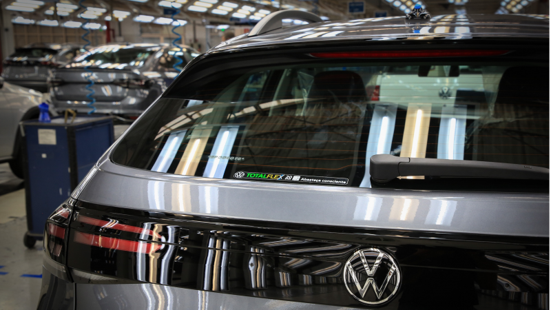Aplicado no vidro traseiro de Polo, Virtus, Nivus, T-Cross e Saveiro, o selo exclusivo trás o logo da tecnologia Total Flex revitalizado para a comemoração. Ao lado, um QR Code direciona o novo proprietário de um VW ao aplicativo do programa Abasteça Consciente.